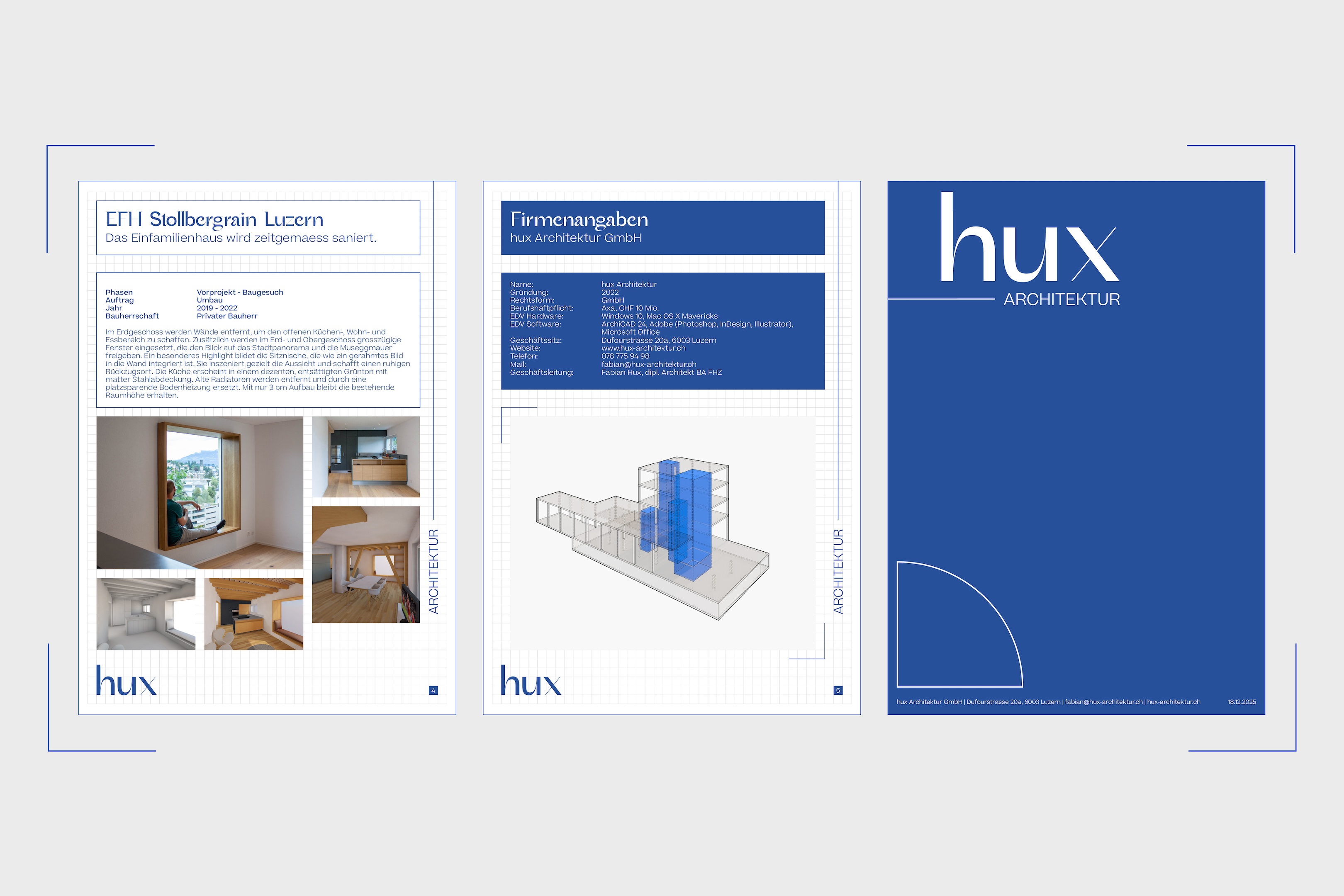 hux Architektur: Elegante, moderne Website mit viel Weissraum, klaren Bildrahmen und Linienrastern als grafische Struktur, ergänzt durch dezente Scroll-Animationen und interaktive Details.