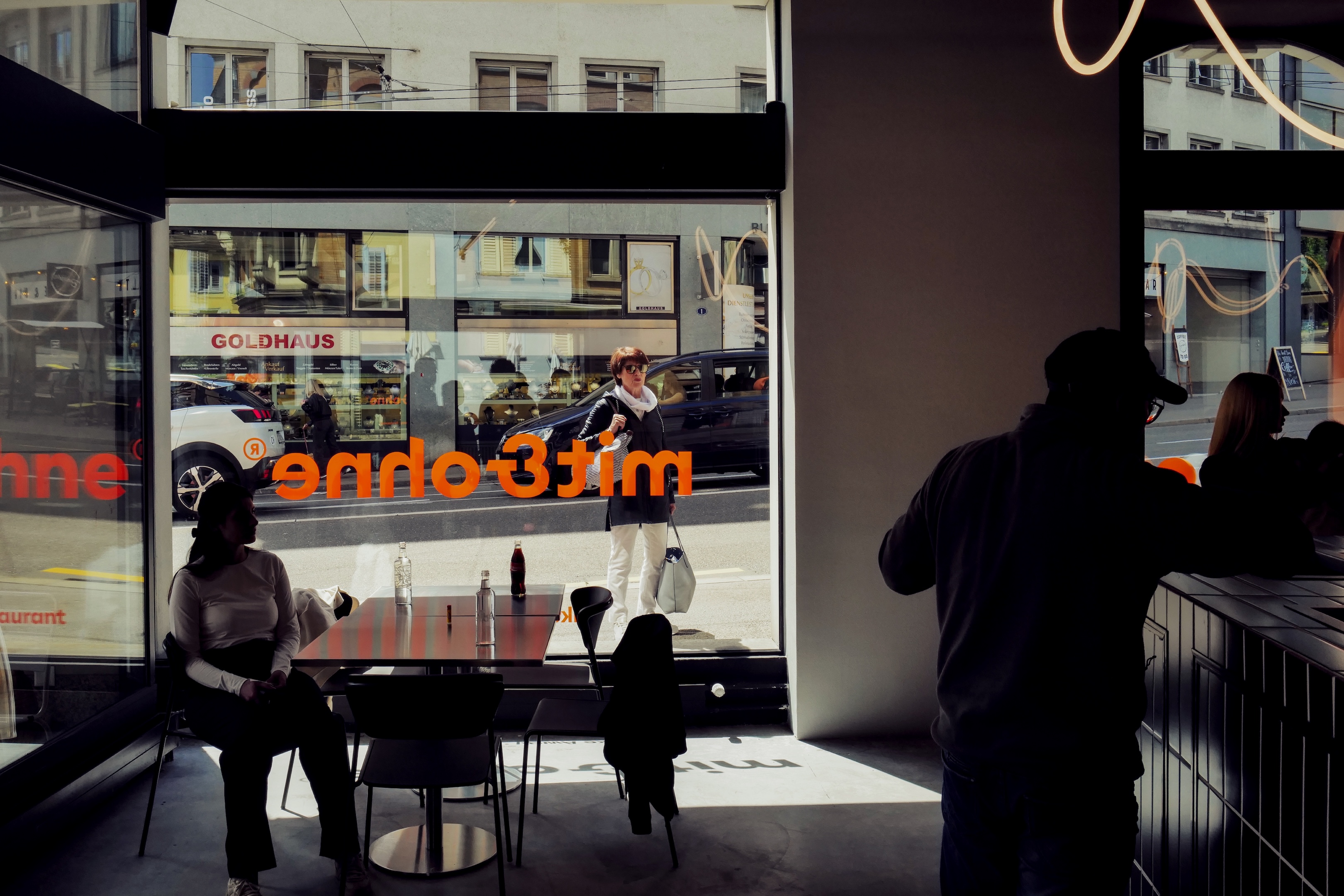 Fünf Jahre später haben wir die Marke gemeinsam weiterentwickelt. Mit dem Rebranding 2025 wurde «mit&ohne» geschärft und für die Expansion in weitere Schweizer Städte vorbereitet. Das Design ist heute bold, klar und urban. Orange, Weiss und Schwarz geben dem Auftritt seine Kraft. Klare Typografie, plakative Wiederholungen und handschriftliche Akzente verleihen der Marke den klaren, urbanen Street-Food-Charakter.