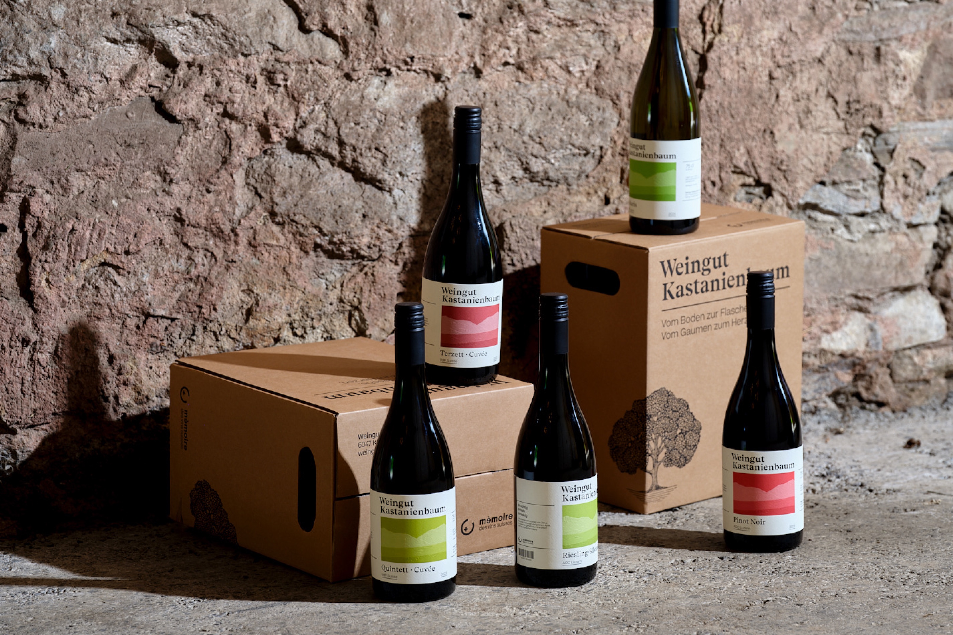 Branding, Packaging & Web für das Weingut Kastanienbaum: Logo, Etiketten, Packaging, Illustrationen, Bildwelt und Webshop – inspiriert von Ort, Baum und Ausblick.