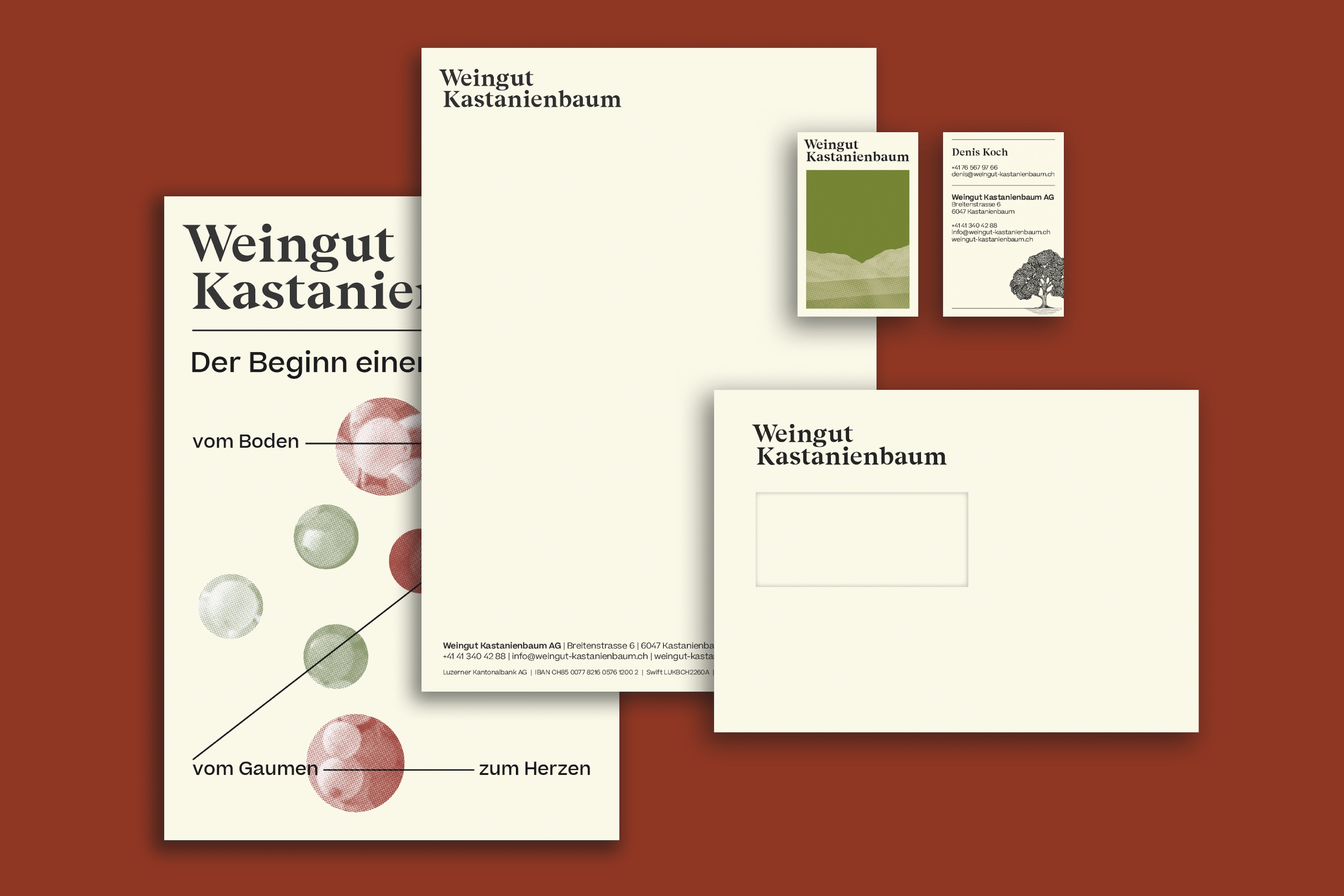 Für das Weingut Kastanienbaum haben wir eine Markenwelt geschaffen, die Ort, Herkunft und Handwerk ins Zentrum stellt. Ausgangspunkt war der alte Kastanienbaum der auf dem Weingut, direkt über dem Ufer des Vierwaldstättersee steht. Er prägt das Logo, Illustrationen und das gesamte Designsystem. Für die Etiketten entwickelten wir ein flexibles System mit 17 Varianten, aufgeteilt in Rot-, Weiss- und Schaumwein. Jede Flasche erzählt visuell ihre eigene Geschichte: Mit abstrahierten Landschaften, präziser Farbwelt und veredelten Details. Tradition und Moderne spiegeln sich in der typografischen Kombination aus Serifen und Klartext, ergänzt durch Linien und warme Naturtöne. Neben dem Packaging kreierten wir auch die Website mit integriertem Webshop sowie ein kompaktes Social-Media-Konzept. So wird die Marke Weingut Kastanienbaum analog wie digital erlebbar.